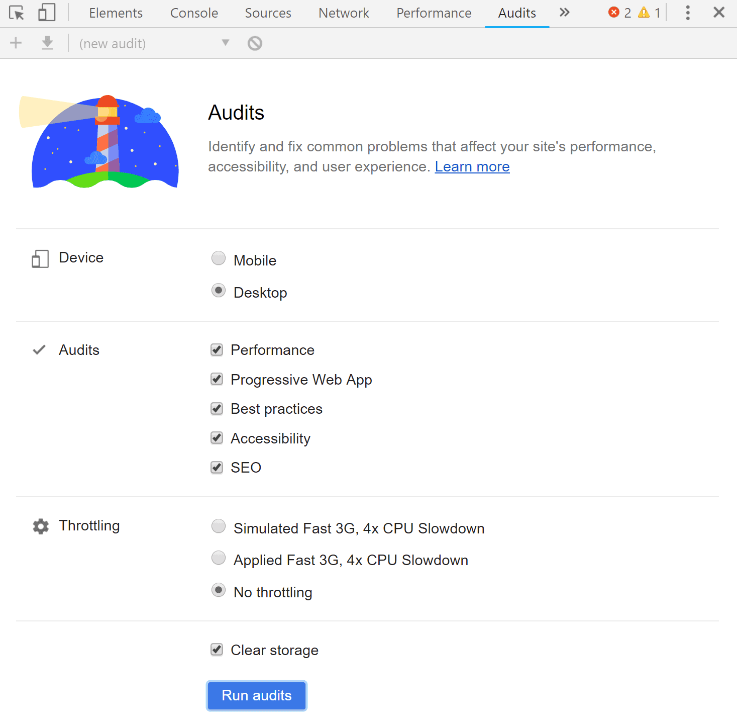 In version 60, Chrome introduced a great new addition to its Developer Tools. It is a comprehensive Audit feature for web pages powered by a tool called Lighthouse. It is an open source tool available on GitHub. To run an audit, you need to open Chrome Dev Tools (F12) and select Audits tab: