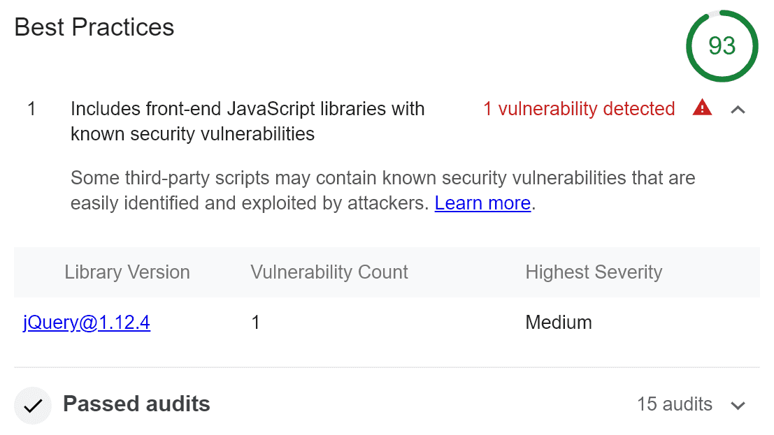 This category contains various miscellaneous items, such as using deprecated constructs, HTTP/2, HTTPS, console logging, password field handling and more. One item which I found really interesting and important is Detection of Javascript libraries with known security vulnerabilities. This is based on integration with a third-party tool called Snyk.