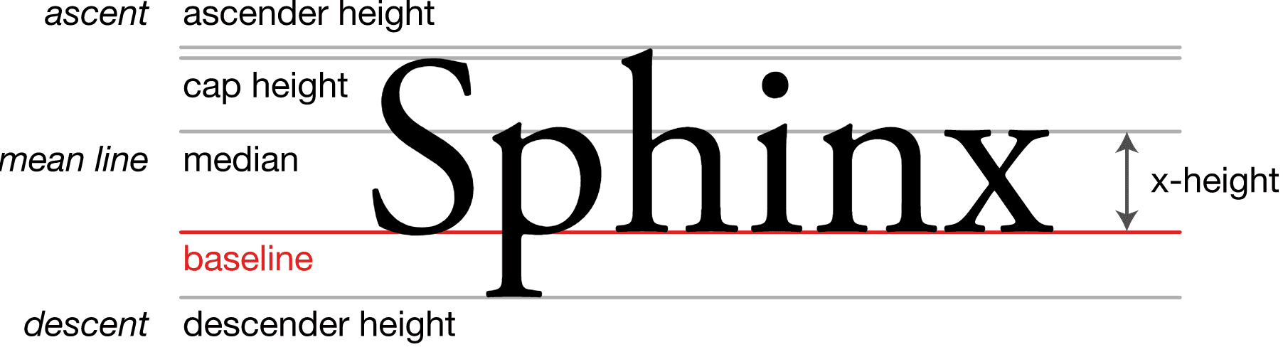 This works as expected and is self-explanatory, considering what we've already learned. The baseline setting is a bit trickier, though. It aligns items by their baselines. The following image from Wikipedia shows this nicely.