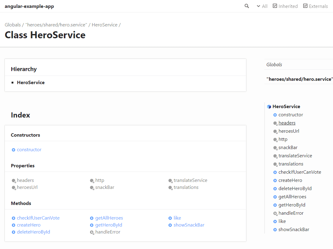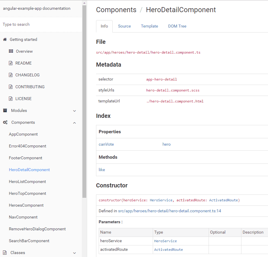 Once you run the compodoc command it will automatically generate your documentation from your project in form of HTML. Unlike TypeDoc, Compodoc understands that your app is an Angular application. That means it understands all the concepts such as components, pipes or directives. Bellow, you can see the generated documentation for a component.