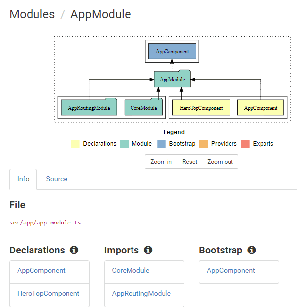 You can see all the properties, constructors, and methods of the selected component. What's more, you can also view the component's source code, HTML template or resulting DOM structure. Since Angular applications consist of modules, it is vital to be able to document them and their relationships. Compodoc allows you to do that. You can even see relationships of each module in a nice diagram.