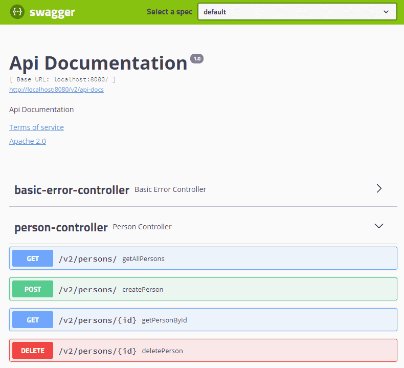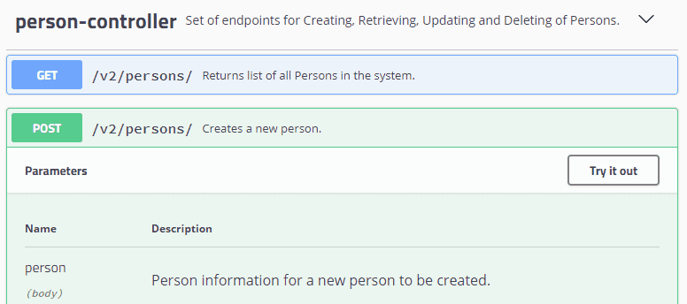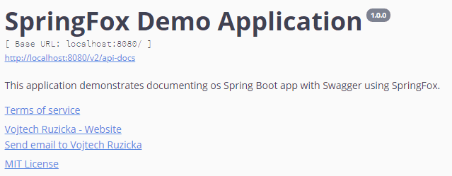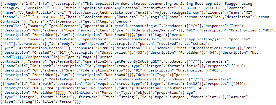 It is however not realistic to write such documentation by hand and keep it updated whenever your code changes. This is where SpringFox comes into play. It is a Swagger integration for Spring Framework. It can automatically inspect your classes, detect Controllers, their methods, model classes they use and URLs to which they are mapped. Without any handwritten documentation, it can generate a lot of information about your API just by inspecting classes in your application. How cool is that? Most importantly, whenever you make changes they'll be reflected in the documentation.