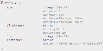 }This is a common practice which is already widely used. The good news is that SpringFox can generate Swagger documentation based on such annotations, so you can utilize what you already have in your project without writing all the constraints manually! It is very useful as consumers of your API know what are restrictions on the values they should provide to your API and what values to expect. Without the inclusion of such annotations, the generated documentation for our person model looks rather plain, nothing except for field names and their data type.