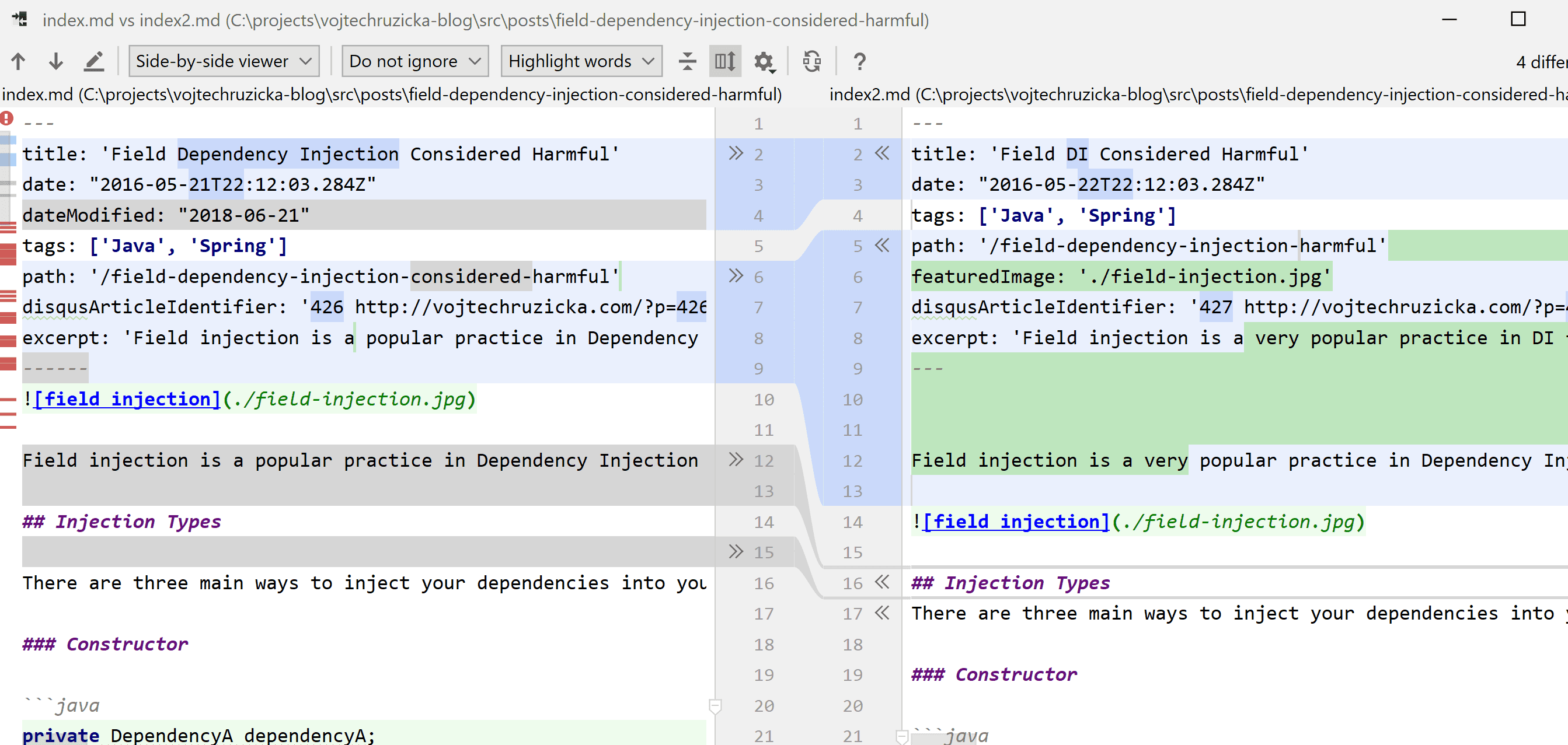 Let's say there are two similar files in your project, and you need to compare them line by line. With IDEA, that's very easy. Just select both files in your project window (holding Ctrl for multi-selection).