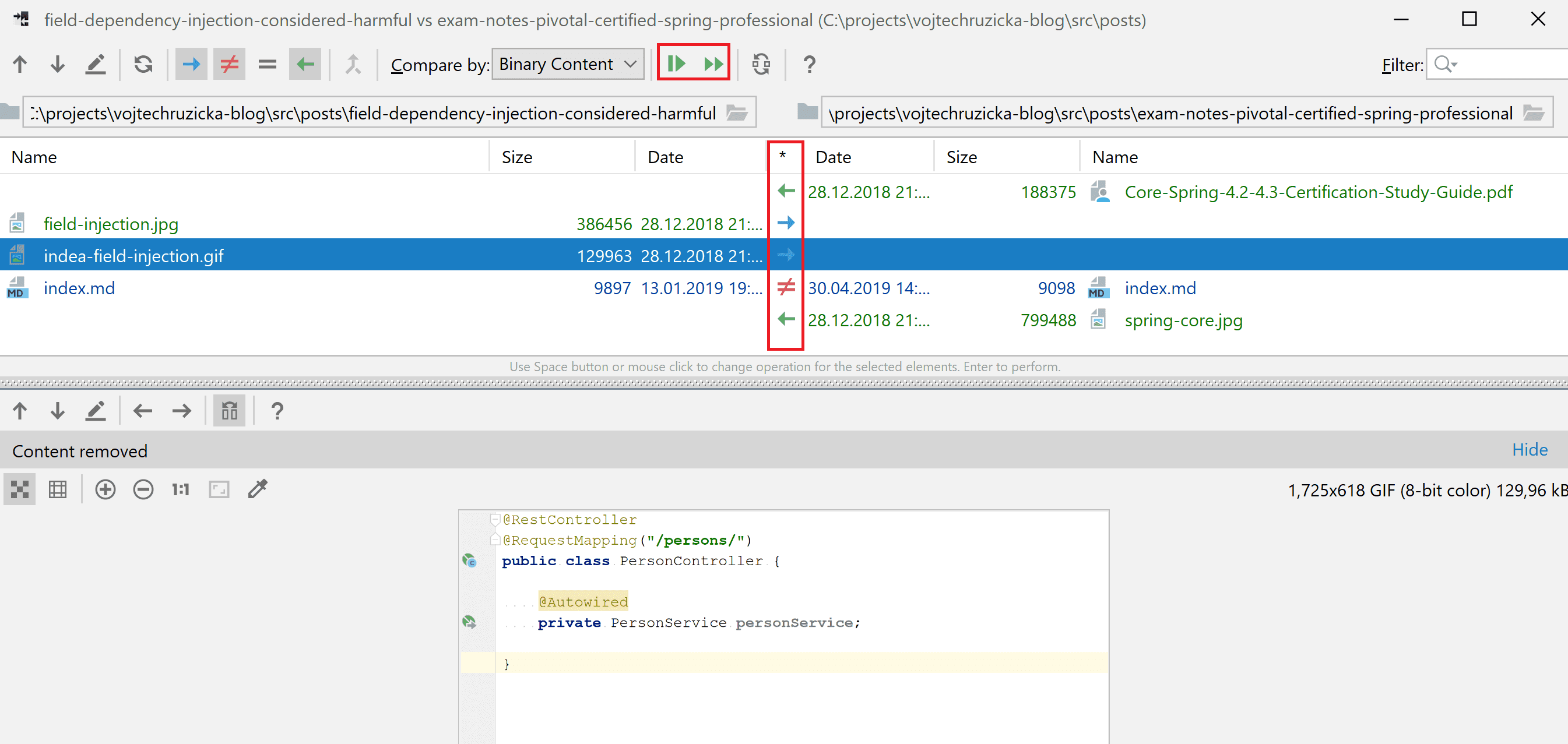 The comparison works not only for individual files but also for whole directories. The process is the same as for files - just select two folders in your Project window and press Ctrl + D or right click and Compare Directories.