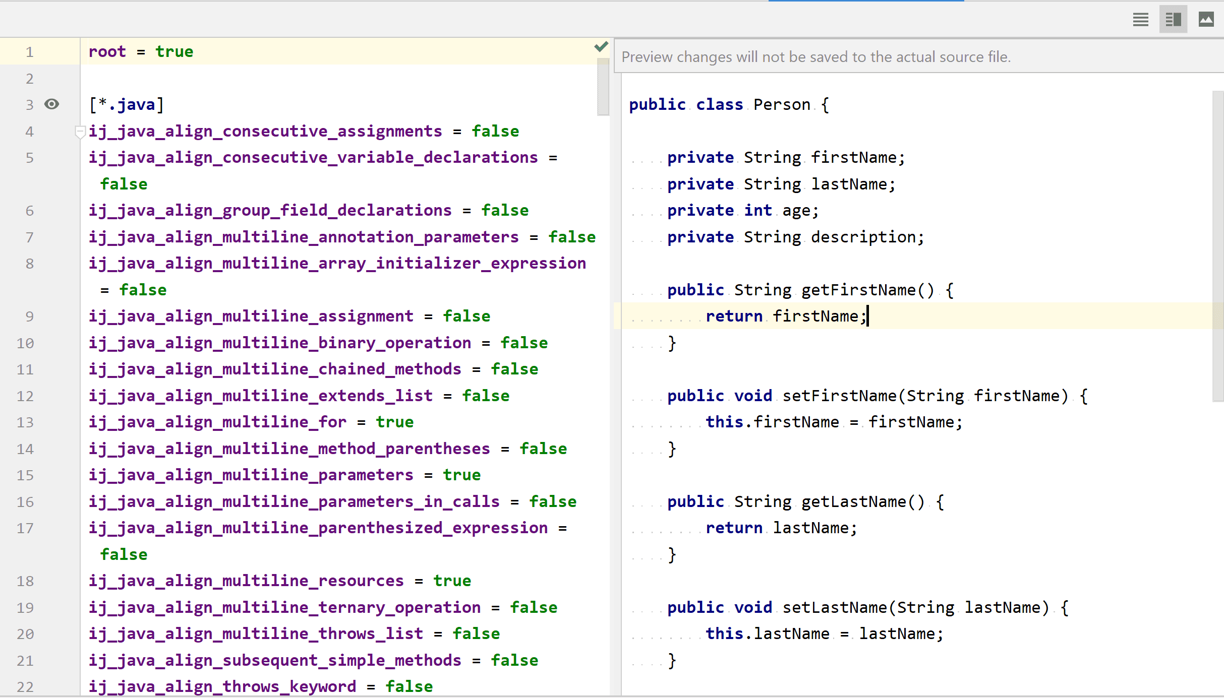 ij_java_array_initializer_new_line_after_left_brace = falseAnd many more. Notice that each of these lines has a prefix of ij_. This way, you can easily distinguish regular settings from IDEA-specific ones.