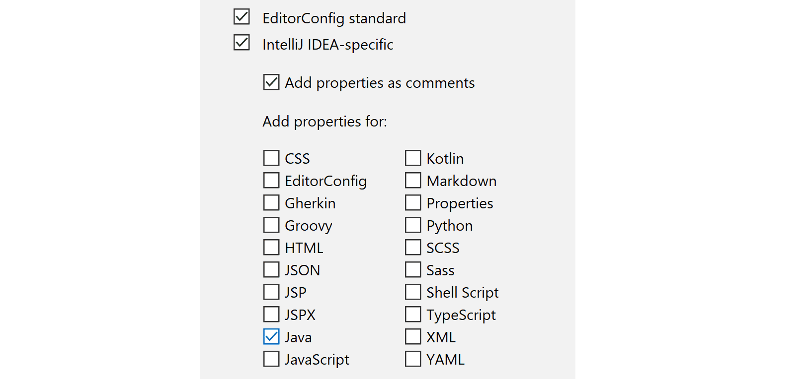 You can select standard core properties, which are supported with every EditorConfig compliant IDE by checking EditorConfig standard. However, you can also check IDEA-specific config properties for various languages supported by IDEA, such as Java, Kotlin, or HTML.