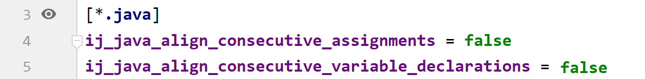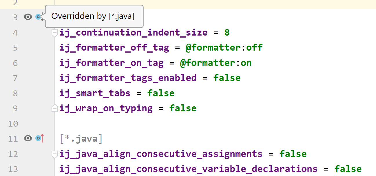 For example, you can have settings for all files [*] on the top of your config file and then section for Java files only [*.java], which overrides some of the general config properties. In such case, IDEA offers you a nice visualization with icons in the gutter area. Similar to the case when you override methods from a parent class.