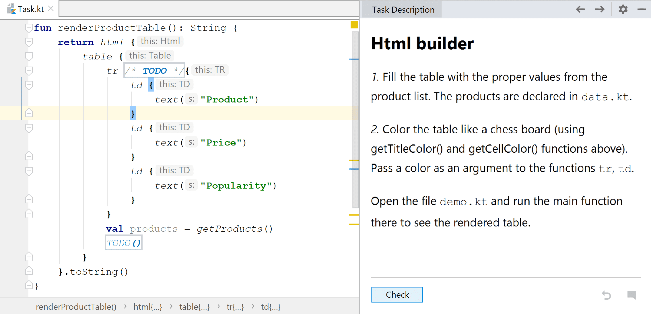 Once you are finished with your task, you can verify your solution by clicking the Check button. It runs predefined unit tests under the hood and based on the result it lets you know whether you passed or not.