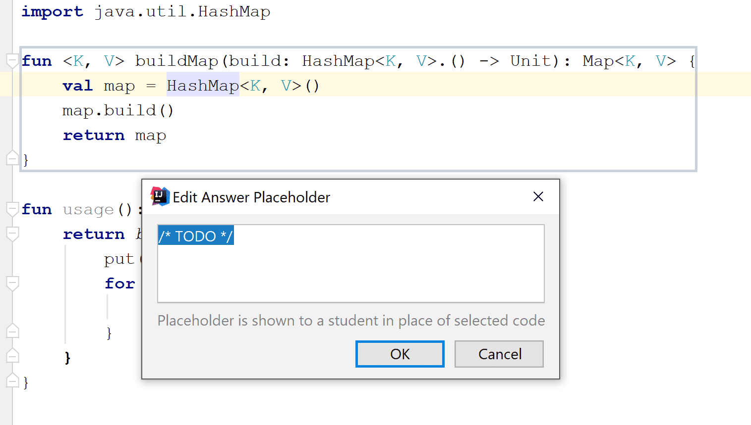 That means you mark specific sections of the code as hidden to the students and instead show some text like "TODO implement here".