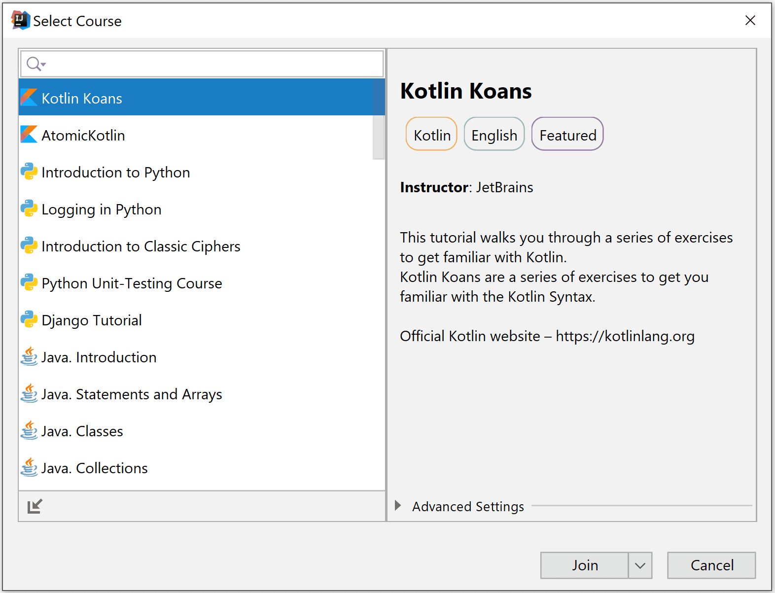 Some courses are gray, which means they are not yet approved by JetBrains. To start a course, simply select it and click Join. The join button offers an alternative action to view the course as an Educator. This allows you to access also solutions and tests, which verify whether each task is successfully completed.