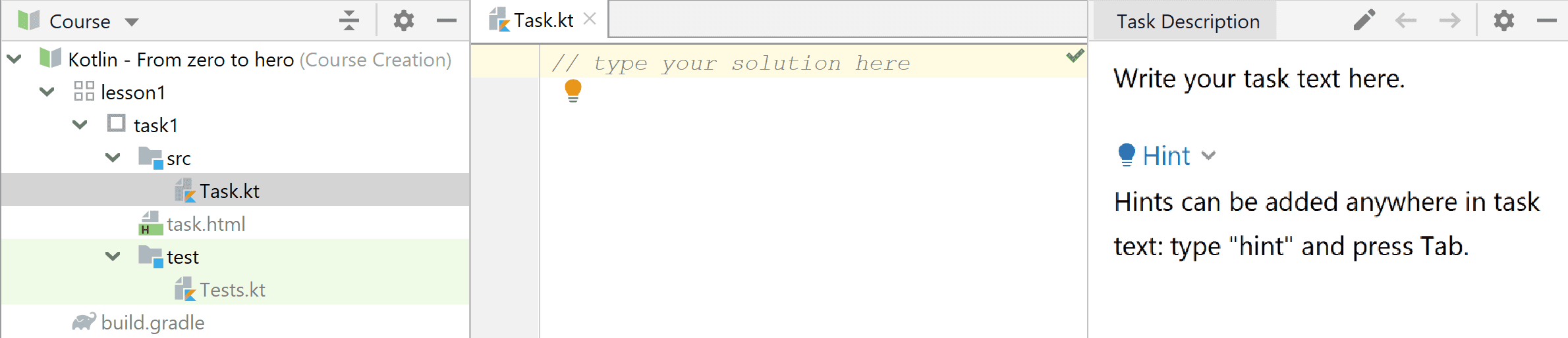 Now when the course is created it's time to make individual tasks. It's pretty simple. Each task consists of three parts.