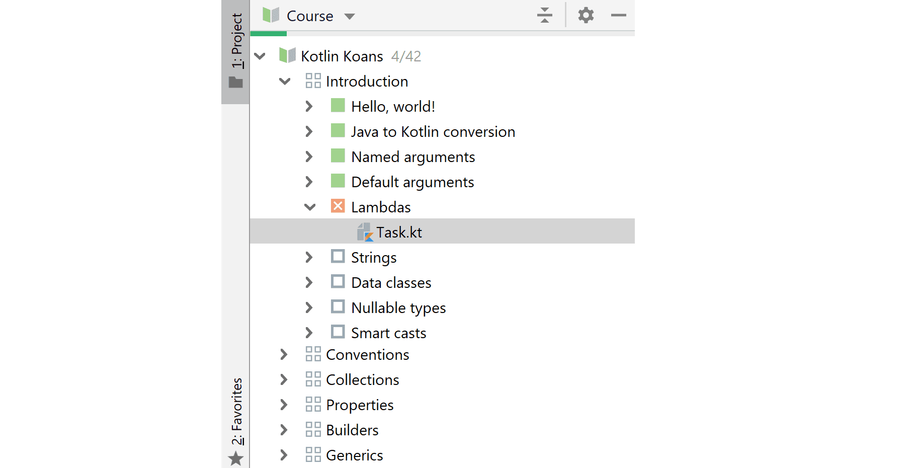 As you can see, that IDEA tracks your progress and shows you what is already finished (green), what is failed (red) and what is yet to be completed (empty checkboxes).