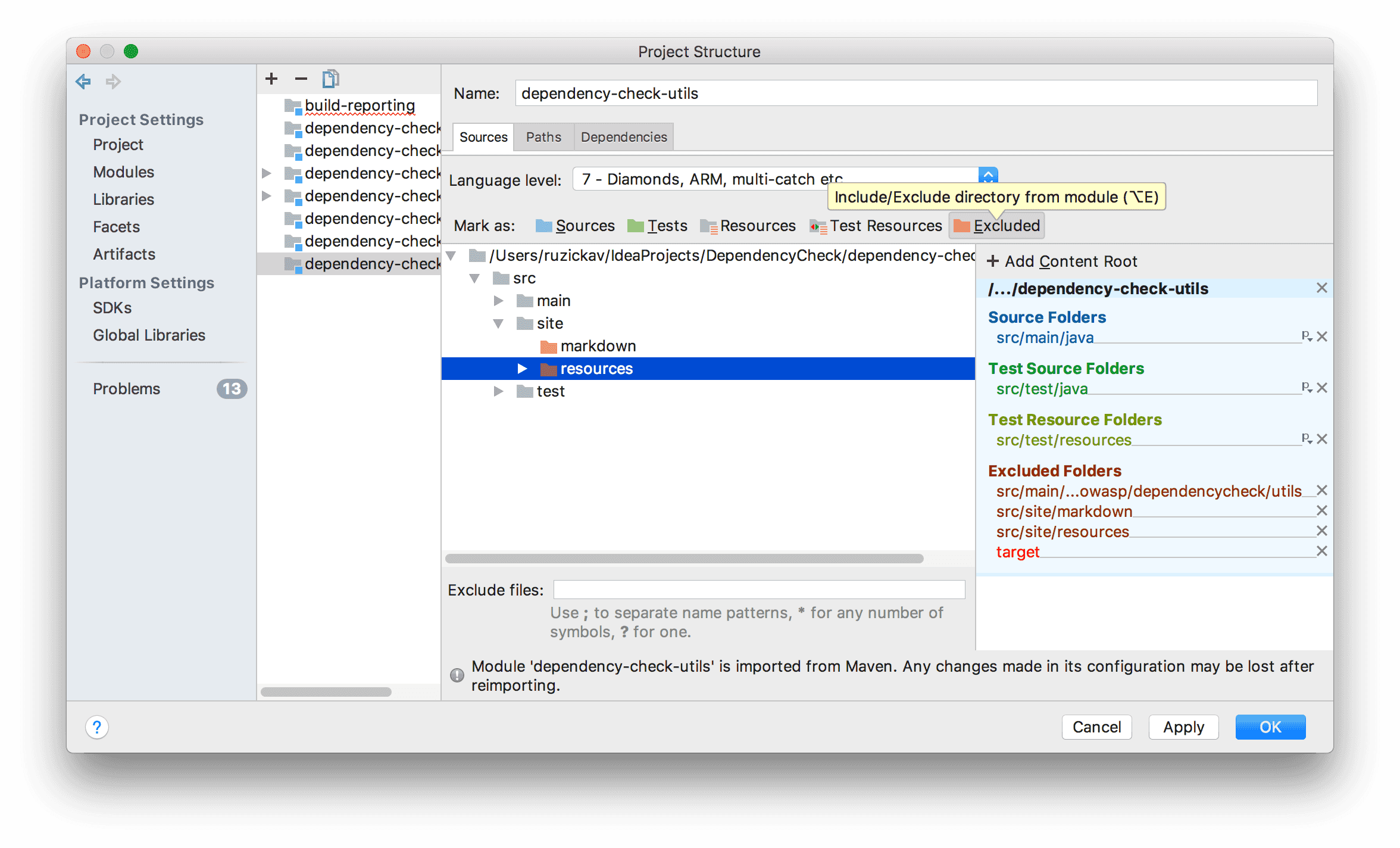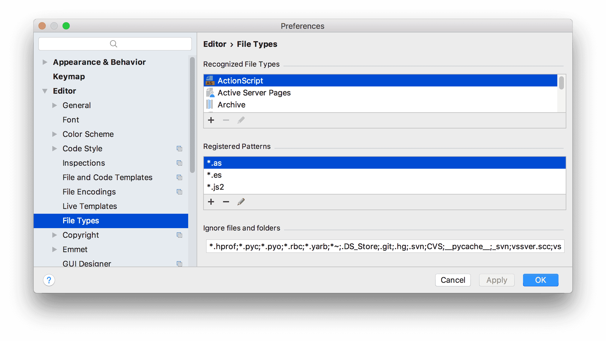 Note that some of the common candidates for exclusion are already presented - such as internal directories for Version Control Systems. If you need more fine-grained control over exclusion, you can do that also on Project level. Go to File → Project Structure → Modules. In the Sources tab, you can mark individual directories as Excluded. You can also exclude files by a pattern for the current module in the bottom part of the window - Exclude files. Note that you can also exclude folders directly from the Project Tree's context menu - Mark Directory As → Excluded.