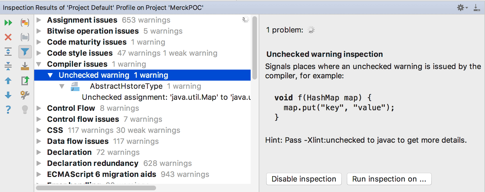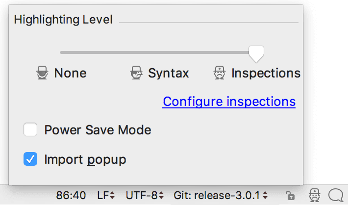 Usually disabling individual inspections does not help much. In that case, there is another option call Power Save Mode. By entering this mode, you can disable the inspections and other CPU hungry tasks altogether. This will lead to much better performance and increased battery life. Power Saving mode can be toggled using Hector (Hector, the Inspector) icon in the lower right corner of the window, in the status bar.