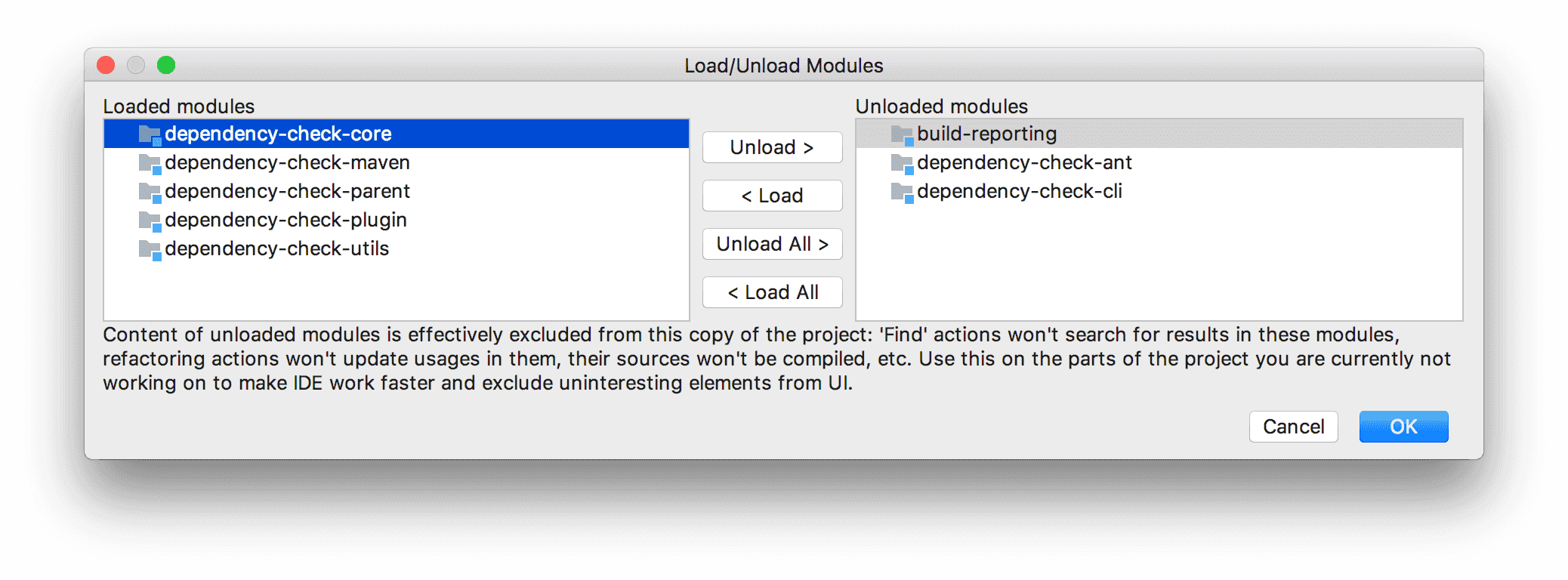Working on a large project with many modules can greatly reduce the IDE performance. IDEA needs to process a huge amount of files when searching, refactoring or inspecting the code. However, it is often not necessary to work with all the modules at the same time. Maybe you are responsible for just one independent module. Maybe you are developing just frontend/backend part of the application. Or maybe the app contains a lot of legacy modules, which are hardly ever touched. In such cases, it would be really helpful to exclude some modules from IDEA's activity completely. Version 2017.2 introduced a new feature called Unload Modules, which allows you to define which modules of the project should be excluded. This can greatly improve IDEA's performance. Once you need an unloaded module again, you can load it, so it is available to IDEA.