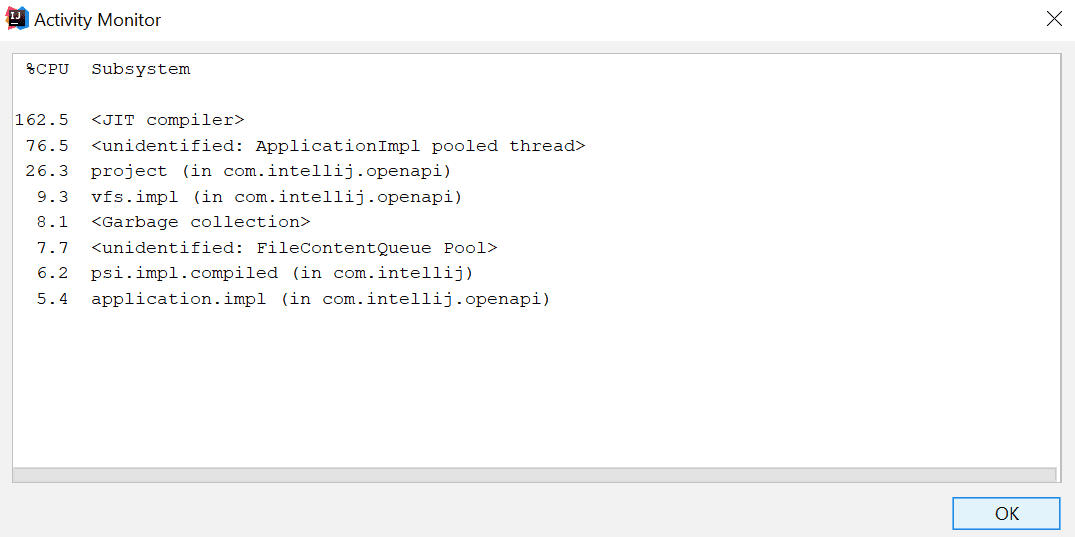 Since version 2018.3, IDEA allows you to run Activity Monitor, which shows you in the real time how much % of CPU are various subsystems and plugins consuming. This works for both built-in and additionally installed plugins. It can help you troubleshoot performance issues.