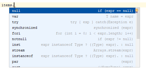 It looks cool and all but what is it good for you say? You can achieve similar results using the regular live templates in most cases anyway. Often you realize later, that you need to do something with the expression you have already written (maybe add not null check just to be sure?) and it saves you backward caret movement. Also, for many people, it is more natural to think in order of - subject and THEN action which needs to be performed with it. In a given context, there are usually very few subjects to choose from (keep your methods short, remember?), but many actions available. It is easier, when you are offered just the relevant actions when triggering postfix completion.