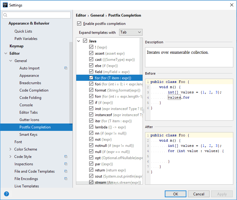 Whenever you have an existing expression, you can append a specific postfix after a dot and apply it using a Tab key. IntelliJ IDEA takes the expression and transforms it based on the postfix provided.