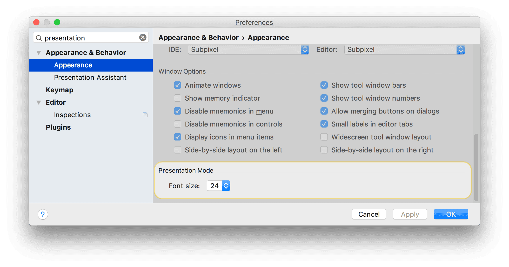 Appearance & Behavior → Appearance → Presentation Mode