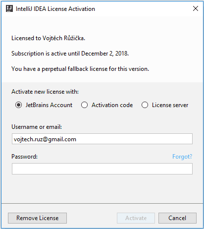 The first thing you need to do is to make sure you have a JetBrains account. If you don't have one, you can create it here. Once you have your JetBrains account, you'll need to Log in to IDEA using it. Just head to Help → Register. Then you just need to select Activate new License with JetBrains Account and enter your credentials. Then click Activate.