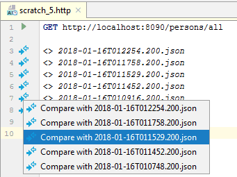 ###The really nice thing is that it is just another .http file. That means that you can directly execute the requests from there again and it uses the same syntax. The second cool thing is that it preserves not only requests but also responses (response bodies only, unfortunately). Each Response body is saved in a separated file indicated by angle brackets. The type of the file corresponds to the received content type, so here it is JSON, but it can be HTML or something else. You can navigate to the response file by Ctrl + Click. Actually, the same response information is also shown in scratch files, but not in physical .http files. When performing the same request multiple times, the response info is preserved for each invocation. Then you can easily compare two of the responses by IDEA's integrated DIFF tool.
