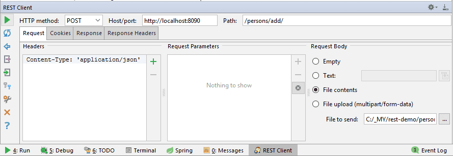 < person.jsonNote that IDEA does help you with autocomplete for both existing files for body and HTTP Headers. What's more, if you specify content type and the body of the request, IDEA automatically treats the request body as if it was written in that language. That means if you choose XML for example, it does check validity, autocomplete tags for you and all the other language-specific features available in the editor. Also, you can include comments in the file using #. It is useful for documenting some special HTTP headers or parameters for example.
