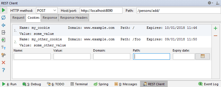 GET http://localhost:8090/persons/allThen you'll need a bunch of HTTP headers. Just add them below the URL, one per line as key-value pairs separated by a colon. Since cookies are just HTTP header, you can include them with the other headers.