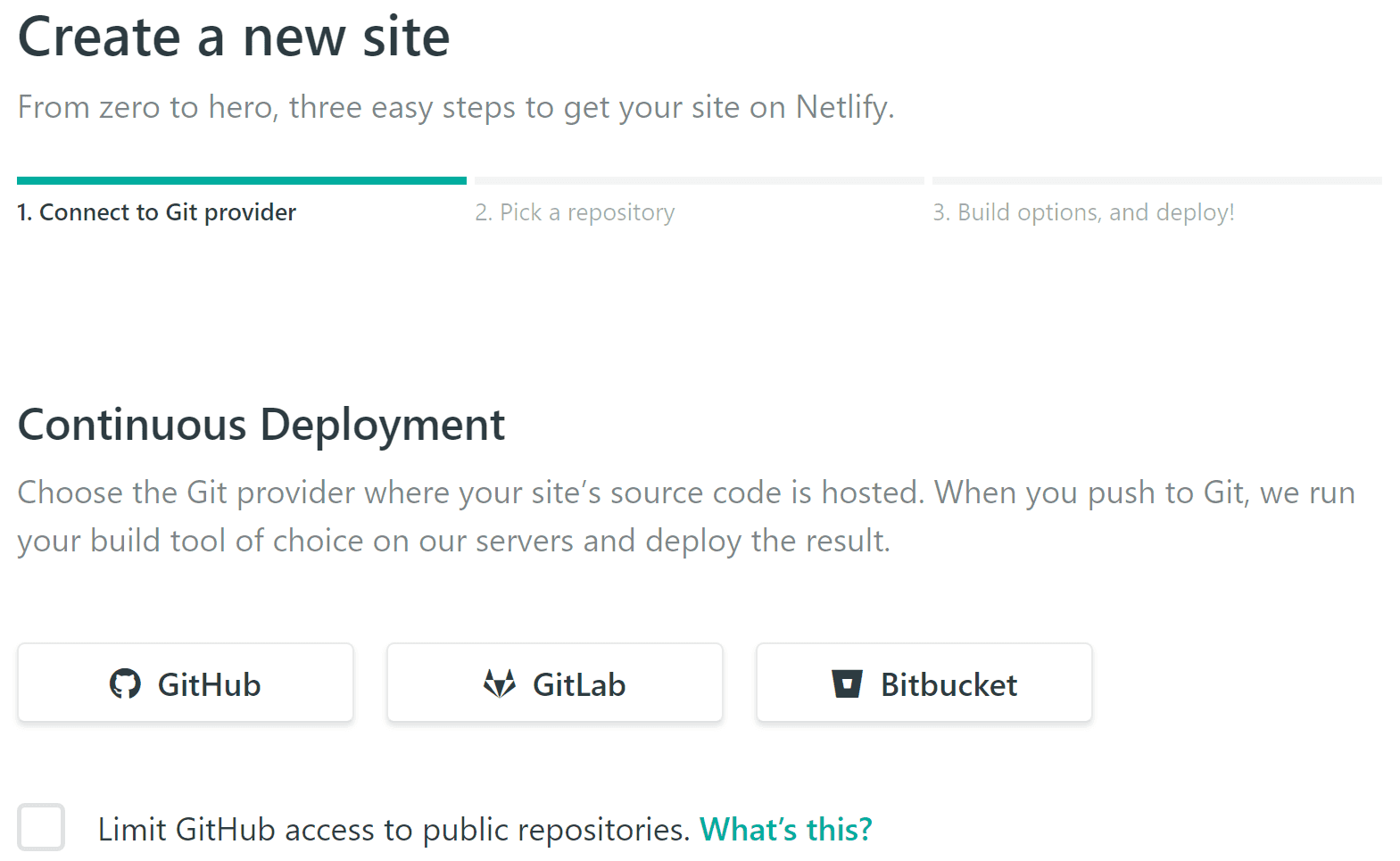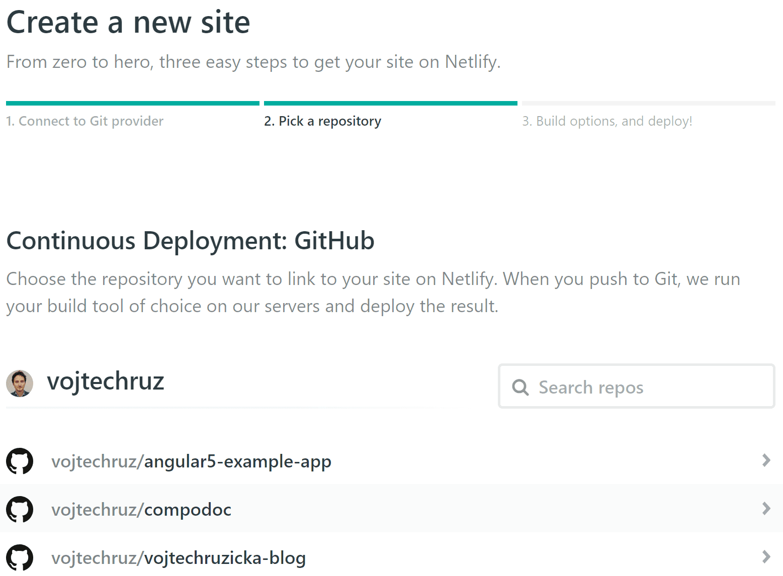 What I love about Netlify is its simplicity. It can take just a minute to set up continuous deployment from your git repository.