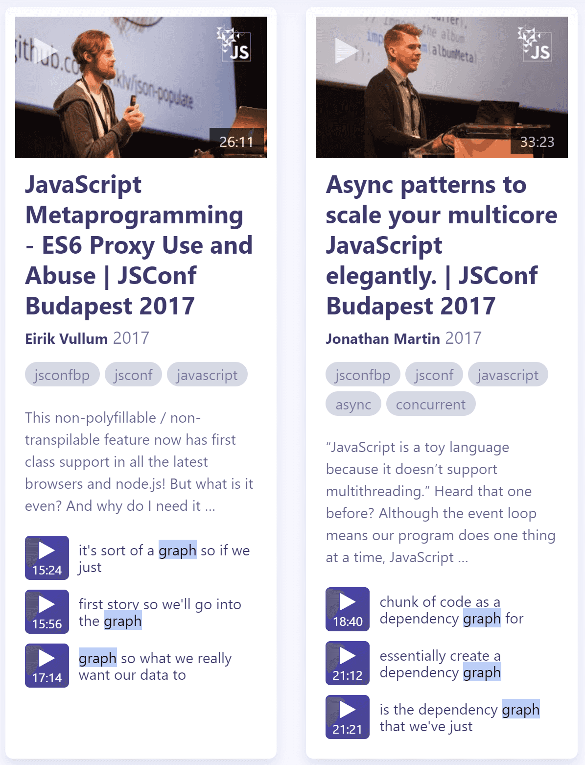 If you also work with videos, Algolia offers another exciting service. It is called Algolia TalkSeach. It allows you to add search to your youtube videos. It fetches transcript for the video and makes it searchable, so you can easily navigate to the part of the video you are interested in.