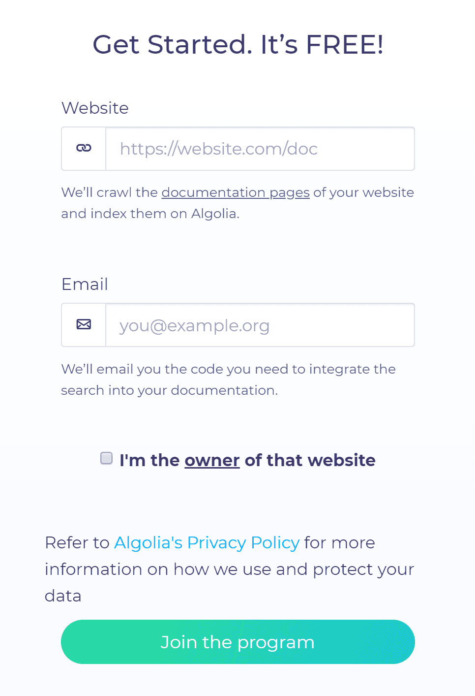 The first step you need to make is to request DocSearch for your site. Just fill a simple form on their website.