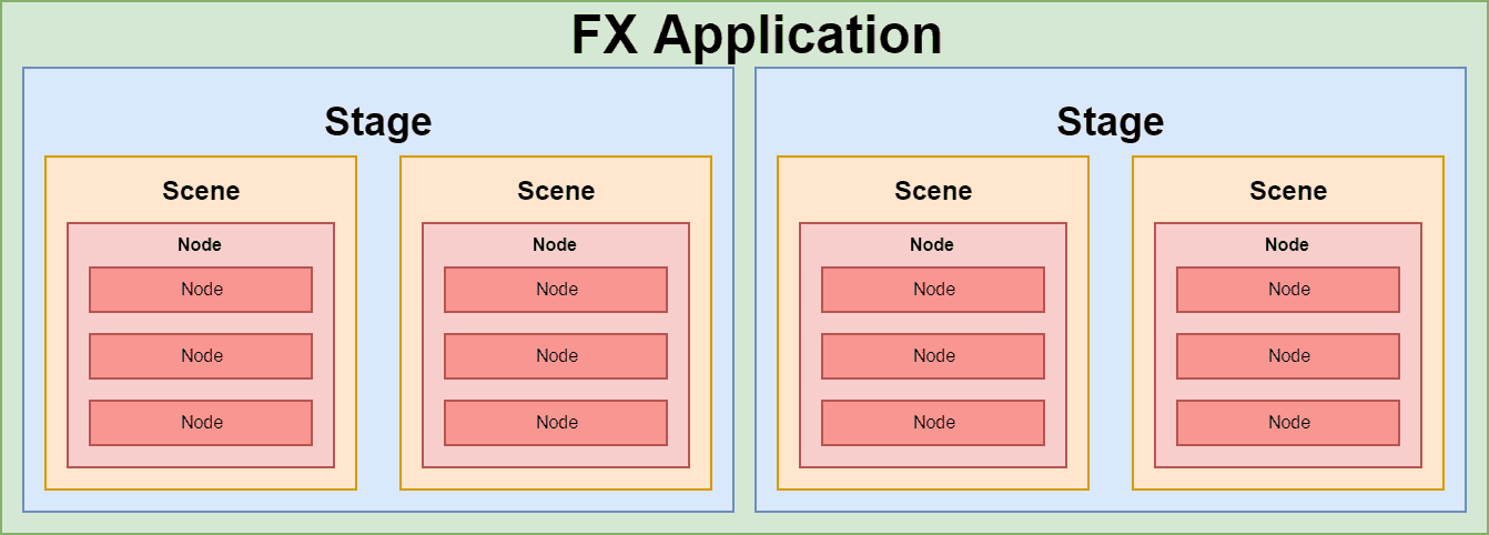 Each application consists of a hierarchy of some basic components. Stages, scenes, and nodes. Let's look at each of them.