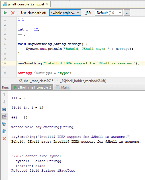 The good news is that if you use IntelliJ IDEA, you don't need to worry about having JShell on the classpath, as IDEA offers excellent integration with JShell out of the box directly in the IDE. You get all the useful features such as code completion, syntax highlighting, error detection and more.