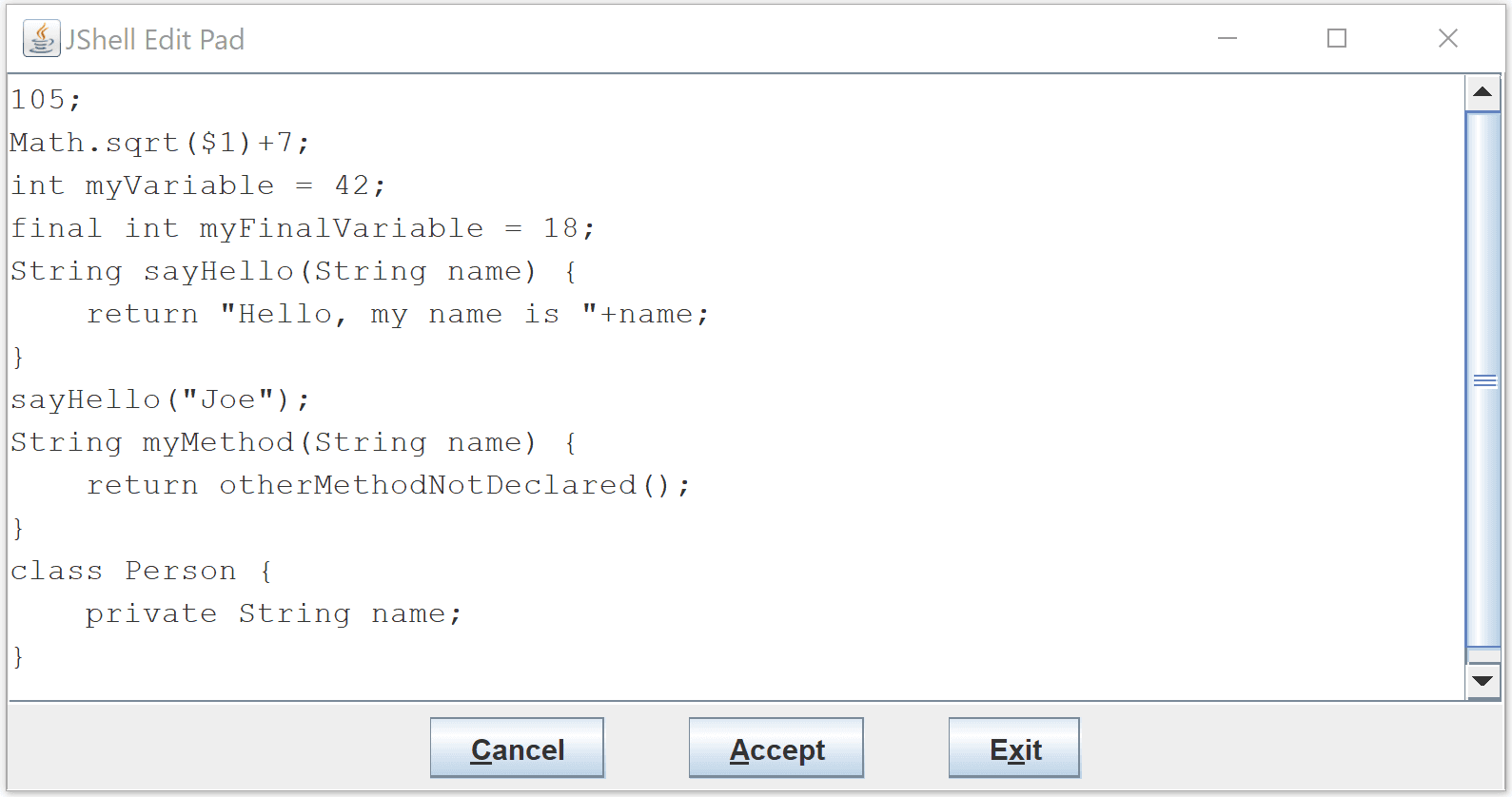 While you can write and edit everything directly in the JShell console, it is not always the best approach. The editing can be tedious and cumbersome. It is often better to use a dedicated external text editor. To open all the code snippets you entered so far in an external editor, type /edit.