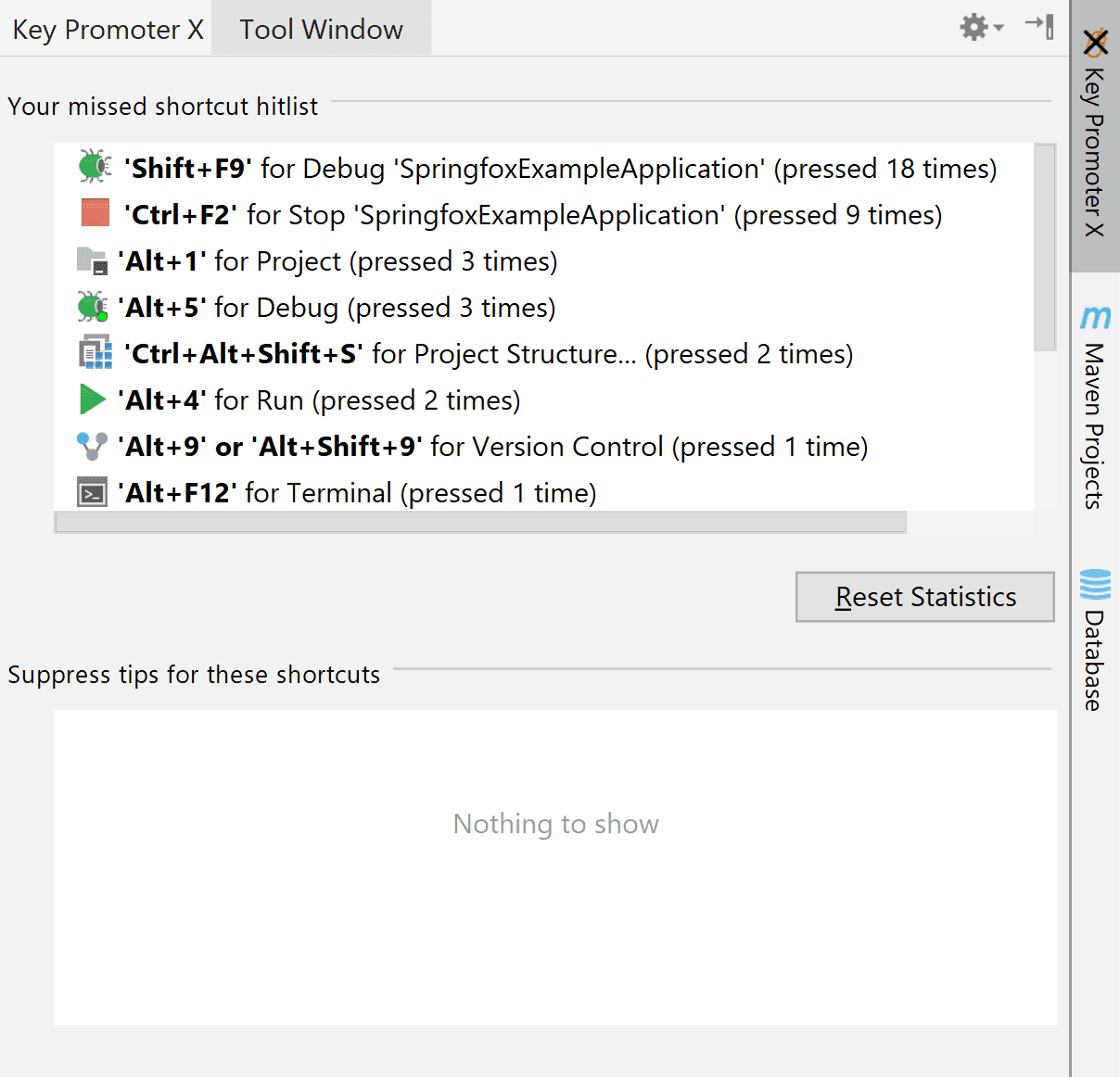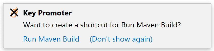 And that's it. The effect is two-fold. First, when you see a pop-up with the shortcut every time you click, sooner or later you remember the shortcut. Moreover, for your frequently clicked actions, the pop-up becomes so annoying after a while, that you'll do anything (hopefully learn the shortcut) to avoid seeing it again. This plugin is especially useful when transitioning from a different IDE like Eclipse or NetBeans and you don't know any shortcuts at all.